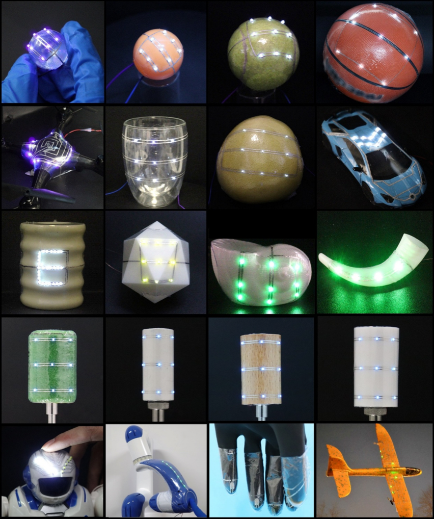 通过该技术,平面电路在约70摄氏度的温水或热风处理后,无论是圆润的苹果、飞机的机翼,还是灵活的手指,都能按照预先设计的“变形蓝图”快速自适应贴合。