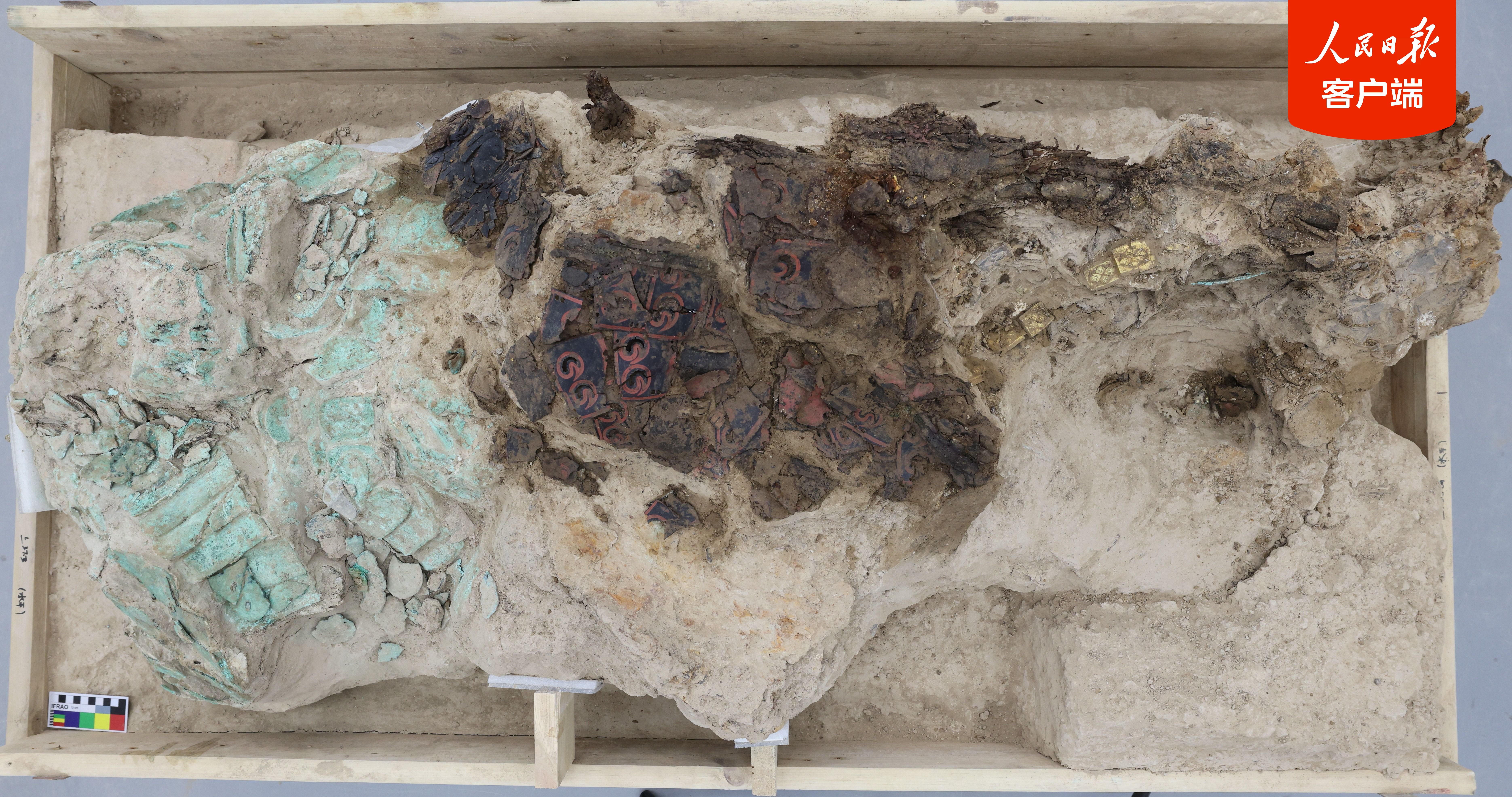 出土时的漆甲、铜甲。