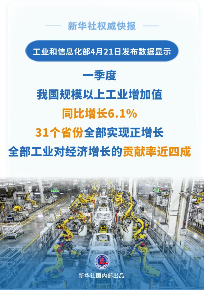工业和信息化部4月21日发布数据显示,一季度,我国规模以上工业增加值同比增长6.1%,31个省份全部实现正增长,行业增长面超八成,全部工业对经济增长的贡献率近四成。 记者:周圆、高亢 海报制作:周圆 新华社国内部出品 编辑:倪婉婧