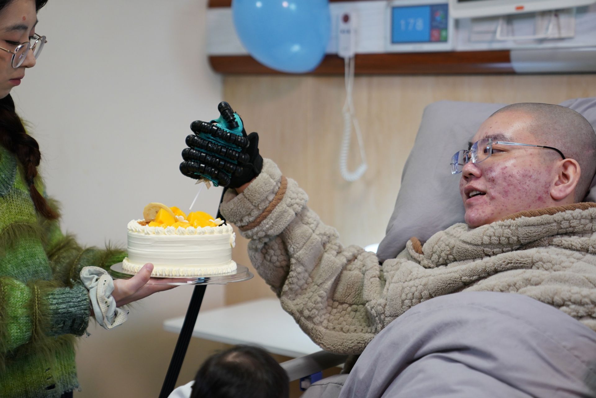 3月28日,邓先生通过脑机接口控制外骨骼给蛋糕插上蜡烛。