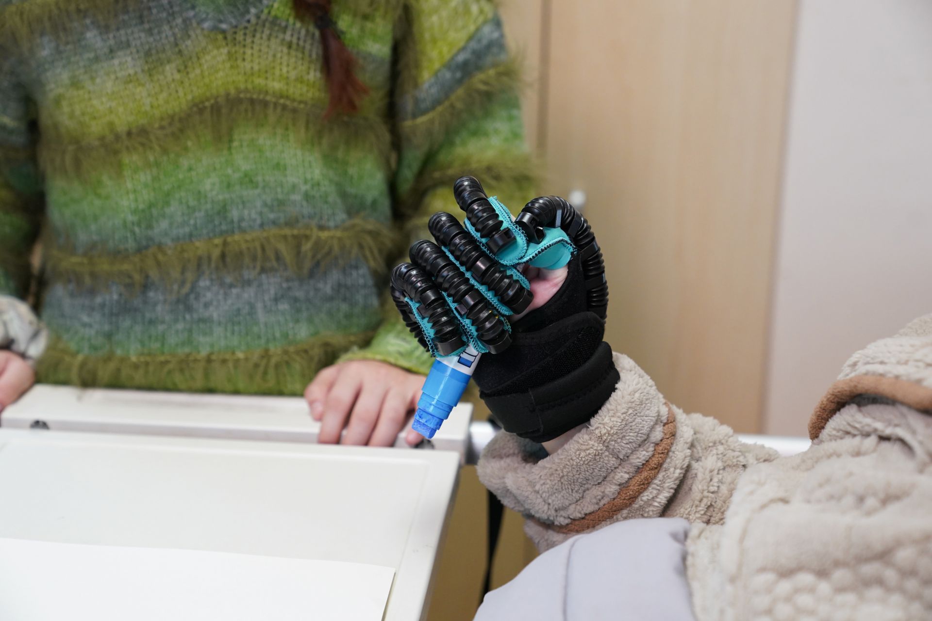 3月28日,邓先生通过脑机接口控制外骨骼握笔绘画。